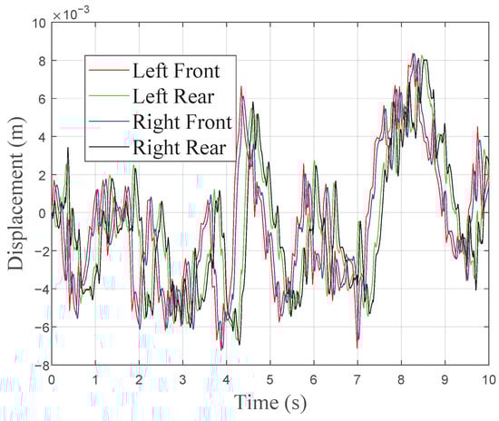 Here, we utilized the MATLAB/Simulink platform to simulate vehicle travel on Class A pavement. According to Table 1, the power spectral density function for Class A pavement is represented as . The vehicle speed u was set to 10 m/s. The time domain plot of the Class A pavement, as obtained from the simulation, is shown in Figure 2.