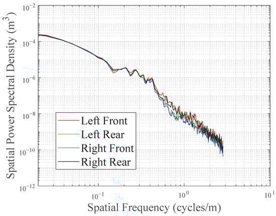 We conducted a spectral analysis using the pwelch function in MATLAB. This function calculated the temporal power spectral density, which we then converted to spatial power spectral density using Equation (8), as illustrated in Figure 3.