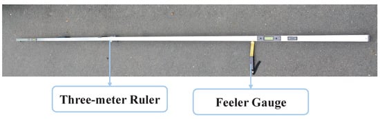 In this study, the three-meter ruler method was employed to measure road surface roughness. The primary instruments used were a three-meter road inspection ruler and a feeler gauge, as illustrated in Figure 4. The feeler gauge with height markings was inserted into the gap to measure the maximum gap height, accurate to 0.2 mm.
