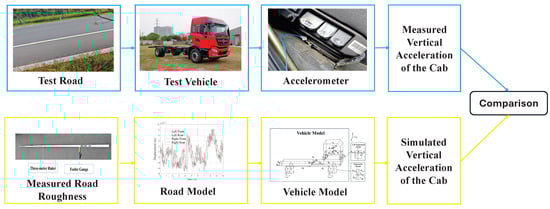 Ensuring the accuracy of the model is crucial in the development of a semi-active suspension system. This study validates the model’s accuracy by comparing the acceleration data generated from the simulation with the actual measured data. The specific method is illustrated in Figure 8, with the following steps: