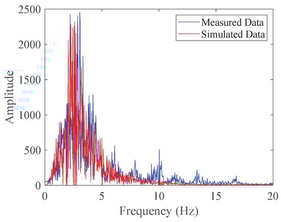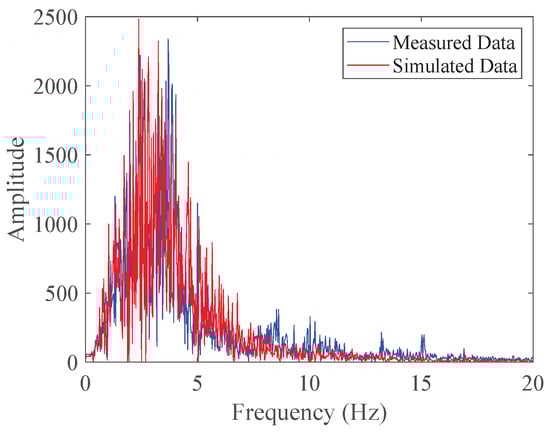 The test vehicle was driven straight for 30 s at speeds of 20 km/h, 40 km/h, and 60 km/h on Sanxia Road in Shiyan City, Hubei Province. The data measured and simulated at different speeds are shown in Figure 9, Figure 10 and Figure 11: