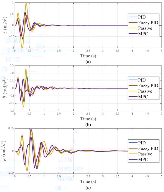 The cab, supported by four cab mounts, exhibits vertical, pitch, and roll motions, the control differential equations of which are demonstrated in Equation (3):