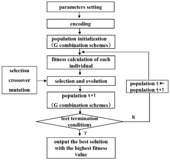 The genetic algorithm entails a method of finding the optimal solution by simulating natural evolution processes. The genetic algorithm maps the phenotypes of all individuals in the population to numerical values, i.e., encoding, and utilizes randomization techniques to efficiently search for an encoded parameter space. After initializing the population, better approximate solutions are obtained according to the principles of survival of the fittest. The genetic operations of genetic algorithms are selection, crossover, and mutation [23,24]. The selection operation ensures the advantageous individuals of the previous generation population are inherited, while the crossover and mutation operations are aimed at obtaining more diverse populations, so as to quickly find the optimal solution.