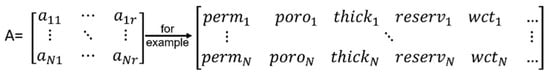 As mentioned above, this method considers various factors that affect the layer regrouping, such as layer thickness, porosity, permeability, remaining oil saturation, recovery ratio, remaining reserves, comprehensive water cut, well section length, number of oil layers, etc. These parameters form an N × r matrix (N is the total number of sub-layers and r is the number of influencing factors); Figure 2 shows the schematic diagram of the parameter matrix.