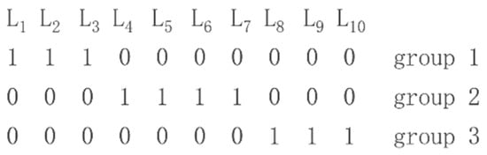 The encoding method of this method is very simple. Each single layer group is represented by a one-dimensional array, and the length of the array is the total number of all layers. If the layer group contains a certain layer, the corresponding position in the array is represented by 1; otherwise, it is represented by 0. Figure 3 shows a combination scheme with 10 sub-layers being divided into 3 groups: “1” indicates that the layer is included in the group, while “0” indicates that the layer is not included in that group.