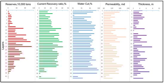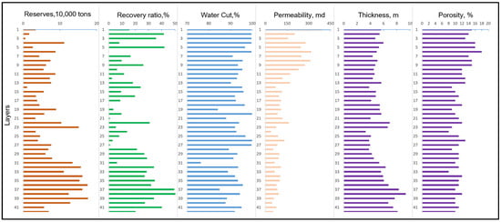 Block X is a waterflooding sandstone reservoir in China (as shown in Figure 5) with 42 individual sand layers vertically and a production history of approximately 35 years. Currently, the cumulative recovery ratio is 30.39% and the overall water cut is 90.74%, indicating that it has entered a high-water-cut stage. The heterogeneity between layers has resulted in significant variations in the development effect of each layer. For instance, the highest recovery of a single layer is 41.25%, while the lowest is only 1.74%. Some layers have no water production, while most have already entered the high-water-cut stage. The geological and development parameters of each layer are illustrated in Figure 6.