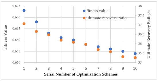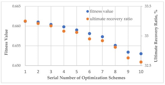 To verify the reliability of the optimization method proposed in this paper, by using the numerical simulation method, the final recovery ratio of the top 10 optimization schemes for each case was calculated. The comparative results are shown in Table 6, Figure 9 and Figure 10. It can be seen that firstly, the optimization schemes achieved higher recoveries than the non-optimization ones and secondly, the trends of the final recovery rate calculated by numerical simulation and the fitness value calculated by the genetic algorithm method are generally consistent: as the fitness value increases, the final recovery rate increases. Therefore, it is demonstrated that the calculation results of the optimization algorithm in this paper are reliable.