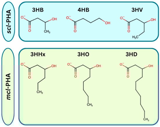 PHAs represent a class of biodegradable polyesters that have garnered notable attention in the domain of food packaging, primarily due to their mechanical, thermal, and barrier properties [44]. PHAs’ molecular architecture is characterized by a helical structure, with the PHA helix maintained through hydrogen bonds formed between the carbonyl groups of individual monomers [45]. These monomers, identified as hydroxyalkanoates, consist of carbon chains ranging from three to five atoms, categorizing them as “short chain length PHA” (scl-PHA), or six or more atoms, designating them as “medium chain length PHA” (mcl-PHA), as shown in Figure 2 [45]. Scl-PHAs include monomers such as 3-hydroxybutyrate (3HB), 4-hydroxybutyrate (4HB), or 3-hydroxyvalerate (3HV) [46]. On the other hand, mcl-PHAs consist of monomers such as poly-3-hydroxyhexanoate (PHHx), poly-3-hydroxyoctanoate (PHO), poly-3-hydroxydecanoate (3HD) [46].