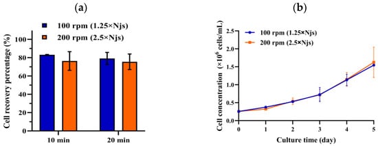 (a) Cell recovery percentage during Trypsinization at two periods, 10 and 20 min, for two different agitation speeds, 100 rpm (1.25 × Njs) and 200 rpm (2.5 × Njs), in 1 L DASGIP bioreactor; (b) cell growth on MCs after undergoing in situ cell detachment. For each condition, two separate experiments were performed.