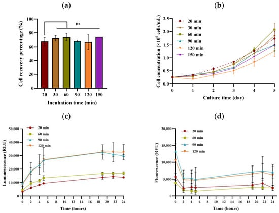 Effect of incubation time: (a) cell detachment efficiency over different incubation times with Trypsin solution (0.25%) (ns: not significant), (b) cell growth monitoring on MCs post-detachment using Trypsin solution (0.25%) at different incubation times, and (c,d) single cells subjected with different incubation time with Trypsin solution (0.25%) and subsequently seeded on plates, with the monitoring of apoptotic (RLU) and necrotic (RFU) cells over 24 h.