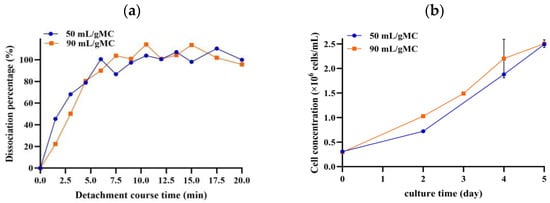 Following cell detachment, as described in Section 2.3, the cells were transferred jointly with the spent MCs to a subsequent bioreactor to monitor the cell growth trend (Figure 1b). The data depicted in Figure 1b indicate that there were no discernible differences in cell growth after the two different treatments at the time of cell detachment. This suggests that the higher agitation speed did not negatively impact the cell properties in ways that could hinder subsequent cell culture.