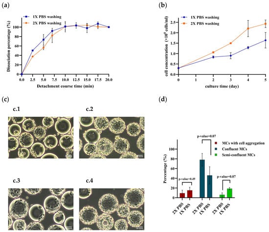 Impact of washing step times on cell detachment and subsequent cell growth: (a) efficiency of cell detachment during treatment with Trypsin–EDTA (0.25%) solution combined with one or two steps of PBS washing at a 40% iv; (b) subsequent cell growth post detachment; (c) monitoring the cell aggregation on MCs during the culture after undergoing one-time and two-time PBS washing during in situ cell detachment: (c.1,c.2) notable presence of cell aggregation on MCs at 2nd day and 4th day of culture for the condition of one-time PBS washing, and (c.3,c.4) no notable cell aggregation on MCs at 2nd day and 4th day of culture for condition of two time-PBS washing; (d) comparison of observed aggregated cells on MCs, and the level of full (confluent) or partial (semi-confluent) coverage of MCs at the end of culture with one or two PBS washing steps (1X PBS or 2X PBS) before enzymatic cell detachment.