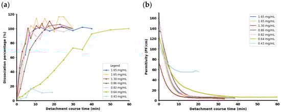 Figure 5b illustrates that the permittivity signal decreased upon the addition of the enzyme solution. Initially, the permittivity signal ranged from 120 to 160 pF/cm, indicating a high concentration of cells in the remaining volume after the removal of the conditioning medium and PBS washing. This signal corresponds to a cell concentration of 6–8 × 106 cells/mL in the residual solution. As shown in Figure 5b, complete cell dissociation from the MCs results in a decrease in the permittivity signal to less than 10 pF/cm. Higher enzyme concentrations produce a sharper decline in the signal compared to lower concentrations. However, at very low enzyme concentrations, the permittivity signal decreases due to solution dilution but does not reach the same low permittivity value, instead plateauing at a higher signal value.
