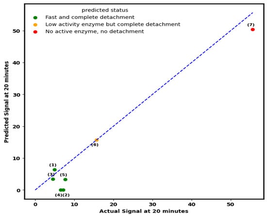 Figure 6 indicates the predictive performance of the model developed according to Section 2.7. It predicts the permittivity signal value at 20 min of in situ cell detachment based the obtained signal from minutes 4 to 7 of the cell detachment course. The model performance, based on the defined conditions in Section 3.6, was evaluated using the Root Mean Square Error (RMSE), which was 4.5.