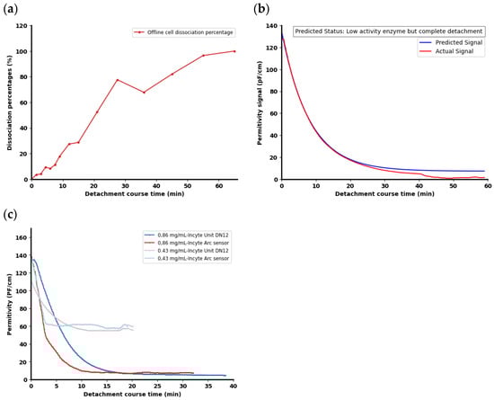 The permittivity signal was measured using two older generation sensors (Incyte Unit DN12–320 and Incyte Unit DN12–420). In Figure 7b, the average signal from these two sensors is depicted in red. The predictive signal generated by the developed model, based on the signal data collected from 4 to 7 min, for the whole course of cell detachment is presented in blue. The predicted signal at 20 min was determined to be 17.88 pF/cm. This value falls between 10 pF/cm and 20 pF/cm, which, according to the conditions defined in Section 2.7, indicates a slow but complete cell detachment at 60 min. The predicted signal closely matched the actual signal observed at 20 min, which was 17.27 pF/cm. The prediction error was minimal, with a deviation of only 0.6 pF/cm.