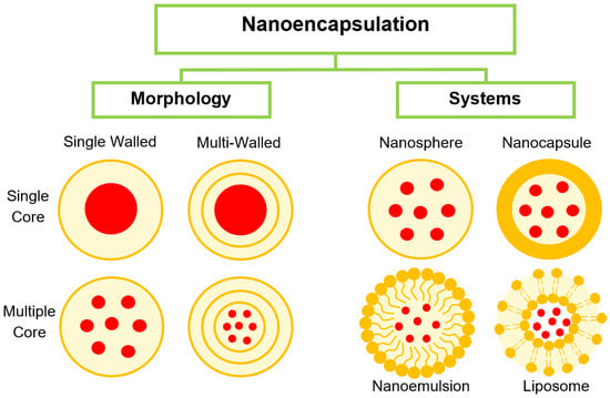 Nanoencapsulation is defined as the technique responsible for encapsulating substances at the nanometer scale [7,56]. These are trapped inside another, thus forming a capsule [57]. Nanocapsules or nanospheres are composed of a series of thin layers, usually spherical in shape, capable of storing gases, liquids, or solids inside them, known as the nucleus, active or internal phase [7,58]. Nanoencapsulation is usually a complex technique compared to microcapsules due to the difficulty of obtaining the proper morphology [56]. Figure 2 shows the different systems and morphology of the nanocapsules.