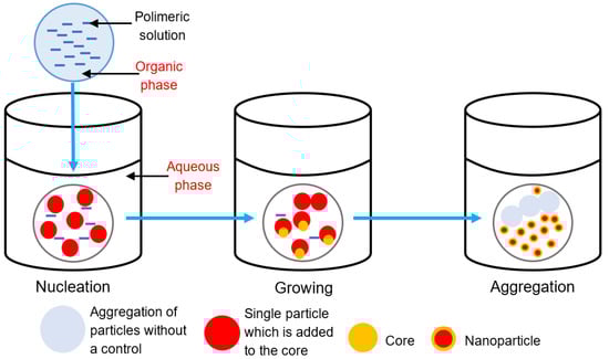 As for the solvent, it must be organic; normally the following are used: acetone, isopropanol, acetic acid, ethanol, and acetone–isopropanol, while the aqueous phase is composed of water and methanol (surfactant) [60]. The mechanism of formation of nanoparticles by this method is based on the theory of nucleation that involves a few steps: nucleation of particles, growth, and aggregation [61]. Figure 3 shows how this process occurs.