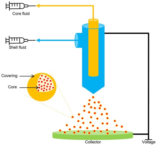 One of the modifications of this method is coaxial electrospraying. With this technique, nanocapsules can be produced efficiently and, without altering their bioactivity, a uniform particle size is also obtained compared to the other methods [68]. Figure 4 shows a schematic of a coaxial electro sprinkler. The elaboration of nanoparticles obtained by this method have better properties of bioactivity, segmentation, and release [69,70].