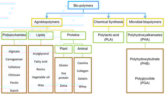 The biopolymers used for the development of biodegradable films and coatings are polysaccharides, proteins, and lipids [17,75], which can be extracted from industrial waste such as agroforestry and fisheries [71,75]. These biopolymers are also known by the term “biobased,” referring to the derivation of the material from biomass [74].