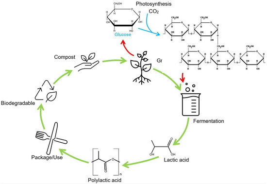 According to Khosravi [103], the importance of using PLA consists of three points. First, PLA is biodegradable, it does not generate polluting waste such as plastics. Second, it is a non-toxic product and does not generate problems in the consumer due to the migration of its components. Third, it comes from a natural and abundant source, and is economical. Finally, the characteristics it brings are like those of plastics, so it can imitate polymers such as polyvinyl chloride, polypropylene, polystyrene, and polyethylene of different densities [81]. The production of PLA containers can be understood as a life cycle as shown in Figure 6.