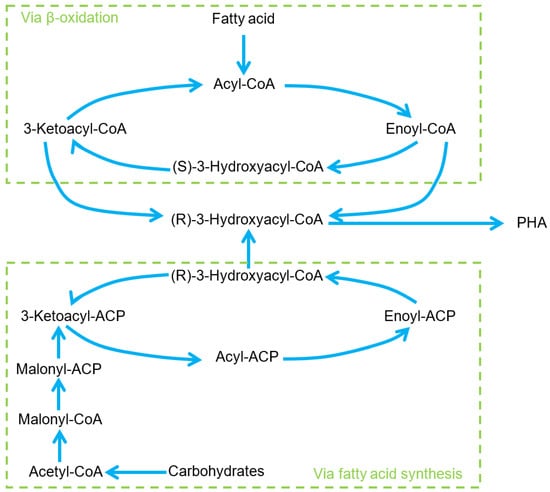 Polyhydroxyalkanoates are polyester biopolymers produced by bacterial fermentation; an example of this is Pseudomonas aeruginosa [97,102]. Notably, microorganisms naturally synthesize PHA polymers with sufficient bioavailability from carbon-rich sources [104]. Figure 7 shows the pathway of PHA synthesis from a fatty acid source. Therefore, the use of these is a practical alternative to be applied in different food packaging systems [97].