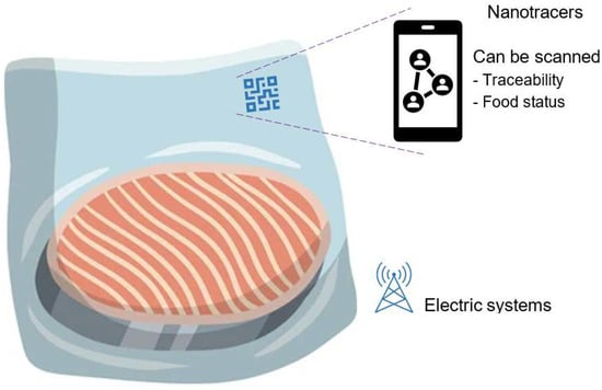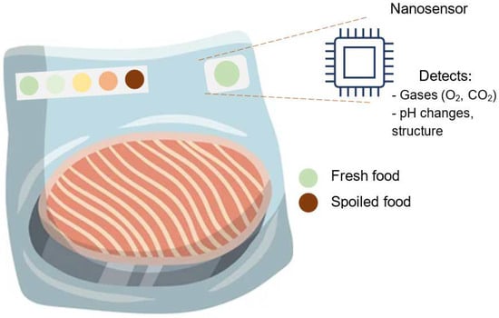 The integration of nanotechnology into the development of intelligent packaging systems primarily involves the creation of nanosensors and nanotracers [106]. Recent advancements highlight the effectiveness of these tools in detecting contaminants produced by biochemical or microbial changes, such as pathogenic microorganisms, toxins, pesticides, and allergenic compounds [8,9,59,107,108]. In addition to these factors, intelligent packaging can monitor changes in color, smell, and texture, supporting its application in demonstrating food freshness [8].