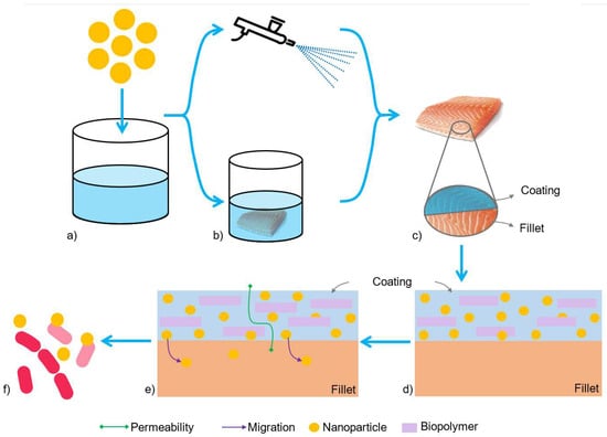 Nanotechnology involves the manipulation, design, production, or application of nanomaterials for various purposes [6,7,8,9]. Recent studies have highlighted the benefits of incorporating nanoparticles into coatings, such as their antioxidant and antimicrobial properties, which are conducive to food preservation and play a significant role in the food industry and aquaculture production [8,10]. Presently, nanotechnology in the food industry is primarily focused on developing diverse materials for coating due to the enhanced mechanical properties like strength and stability offered by nanoparticles compared to micro and macroscale materials [10,11].
