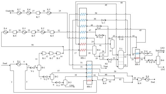 In nature, helium can be found in air, helium-bearing natural gas and geothermal hydrous dissolved gas. Among them, helium-bearing natural gas is the primary source of helium extraction [8]. The methods for helium extraction from natural gas include cryogenic distillation [9,10], membrane separation [11,12,13,14], pressure swing adsorption [15,16], and others. The cryogenic distillation method is the most widely used and versatile technology for helium separation, typically separating helium at temperatures below −65 °C to produce high recovery and high purity helium. It is estimated that over 90% of helium is extracted using the cryogenic distillation method [17,18]. In addition, the cryogenic distillation method can be further divided into three processes: flash, distillation, and integrated flash and distillation processes [19]. The process of flash is simple, but it has low helium recovery and product purity. Distillation, on the other hand, has higher helium recovery compared to flash process, but with lower heat exchange efficiency [20]. Currently, a lot of helium extraction processes are integrating flash and distillation, aiming to improve the production efficiency and economic benefits of helium [21]. Normally, cryogenic distillation is economically beneficial when the helium content in the feed natural gas exceeds 0.1 vol%. However, in the case of extracting helium from the end-flash gas of the liquefied natural gas (LNG) production unit, the increased helium content in the end-flash gas reduces the requirement for helium content in the feed gas. Furthermore, due to the synchronous production of LNG, the economic benefits of the helium extraction process are significantly enhanced. Therefore, extracting helium from LNG end-flash has become one of the major approaches.