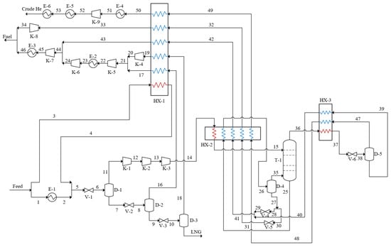 The Exxon Mobil integrated process also involves a combination of flash and distillation. In comparison with the Linde integrated process, the products of Exxon Mobil do not include liquid nitrogen, and crude helium is purified through the distillation column. All process parameters are set according to the research by Mehdi et al. [25]. Table 2 presents the feed and product flow data. The process is illustrated in Figure 2. The helium-bearing natural gas (Feed) is divided into two streams (1 and 3) through a splitter. Stream 3 accounting for 96.6%, undergoes cooling in a LNG heat exchanger (HX-1), while stream 1 is cooled in a refrigerator. Both streams are cooled to −146 °C, and then enter a three-stage flash separation process. The flash pressures for each stage are 390 kPa, 260 kPa, and 130 kPa, respectively. Gases from the second and third separators (16 and 18) are utilized for the production of fuel gas and provide refrigeration for the refrigerator. The helium-rich stream (11) is compressed to 4000 kPa in the three-stage compressor, with a compression ratio of 2.2 for each compression stage. Stream 14 is cooled to −130 °C in a LNG heat exchanger (HX-2) before entering the distillation column for helium enrichment. Stream 36 is flashed after heat exchange to produce crude helium, while Stream 25 undergoes heat exchange in HX-2 to supply feed to T-1 at the bottom of the column.