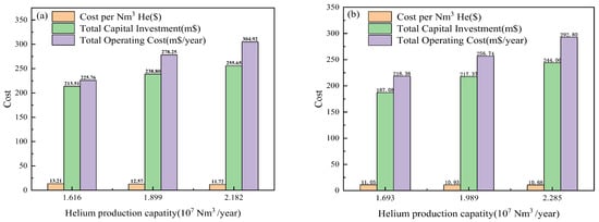 At different processing scales, the trends and magnitudes of change for CAPEX, OPEX, and the cost per Nm3 of crude helium product are similar for both processes. The CAPEX, OPEX, and cost per Nm3 of the crude helium product for the Linde process are higher than those for the ExxonMobil process, consistent with the results obtained from varying feed compositions.