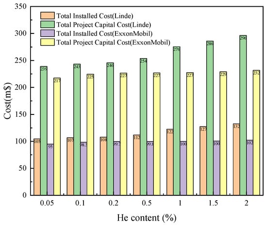 As for Case 1 (or Case a), the equipment investment cost for the Exxon Mobil integrated process is USD 94.99 m, and the CAPEX is USD 217.37 m. The helium content in the feed has no significant impact on the equipment investment cost and CAPEX for the Exxon Mobil process. When the helium content of the feed reaches 2%, the equipment investment cost and CAPEX are USD 102.16 m and USD 231.71 m, respectively. However, the higher nitrogen content of feed results in the increasing equipment investment cost and the total capital cost. When the nitrogen content is increased to 20%, the equipment investment cost and the total capital cost are USD 126.63 m and USD 281.09 m, respectively, and the cooling temperature rises from −146 °C to −110 °C as the nitrogen content increases from 5% to 20%. Table 7 shows the profitability analysis under different feed compositions for Exxon Mobil’s integrated process. When the helium content of the feed is 0.2% or higher, the payback period is less than 3 years.