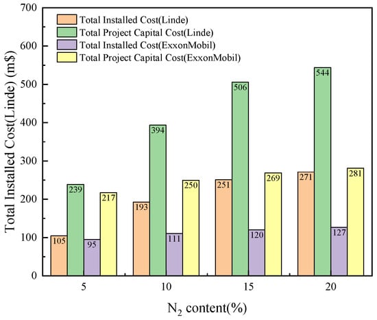Comparison of CAPEX and TIC changes with N2 content between Linde and ExxonMobil integrated process.
