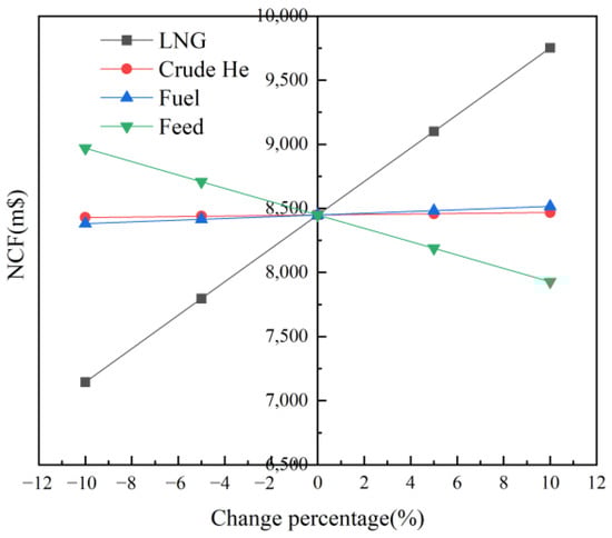 As is shown in Figure 6, product prices have a positive impact on net cash flow, while feedstock prices have a negative impact on net cash flow (NCF). The sensitivity is 1.543 for LNG product price, 0.023 for crude helium product price, 0.081 for fuel gas product price, and 0.616 for feedstock prices. Specifically, the change in LNG product price has a significant positive impact on net cash flow, while the change in feedstock prices has a certain negative impact. The changes in prices of both crude helium and fuel gas products have a relatively small impact on net cash flow.