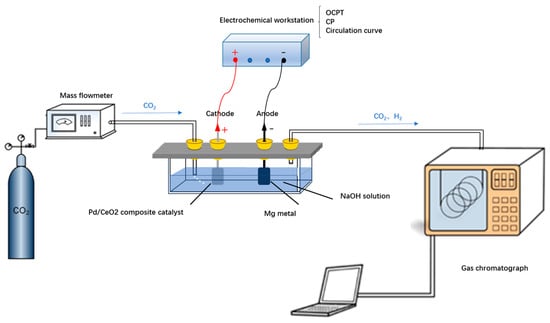 The cavity of the Mg-CO2 battery system was designed to be 240 × 110 × 140 mm, and it contained 2 L of the NaOH electrolyte. The two electrodes were designed to have a size of 70 × 70 × 4 mm and were encapsulated on a polypropylene plate in the electrolytic cell, maintaining at least 50 mm between the two electrodes. The cathode was a Pd/CeO2 composite catalyst and the anode was a Mg metal both of them connected to the auxiliary reference electrode. One end of the panel contained the CO2 air inlet, and the other end was the H2 outlet, as shown in Figure 1. An external electrochemical workstation collected the performance indicators of the Mg-CO2 battery, such as the constant flow discharge curve (CP), the open-circuit voltage–time curve (OCPT), and cyclic voltammetry (CV).