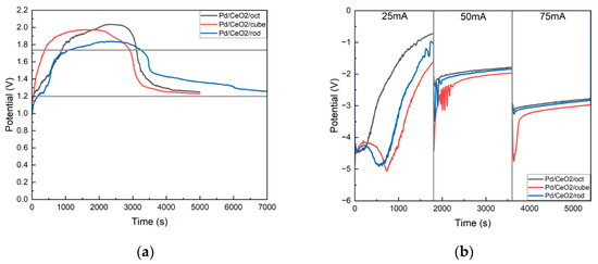 Under conditions of 50 mA and 75 mA constant current discharge (Figure 2b), the potential changes in the three cathodes were small, indicating that the electrocatalytic activity and stability of the three electrodes were relatively good. Among them, Pd/CeO2-cube and Pd/CeO2-rod had certain potential fluctuations [32]. In general, the Pd/CeO2-oct electrodes had the fastest voltage response speed and the lowest open-circuit voltage, showing better battery performance. It is worth noting that, in subsequent experiments, the Pd/CeO2 oct electrodes were used to study the performance of CO2 batteries.