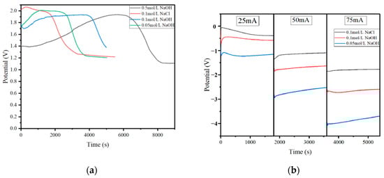 Combined with the open-circuit voltage curve of the CO2 battery test, as shown in Figure 3a, the incoming CO2 and NaOH reacted at the beginning, the solution’s pH value was high, and the open-circuit voltage was low. The open-circuit voltage corresponding to the NaCl solution increased at the beginning. After a period of time, the pH value gradually decreased as NaOH transformed into NaHCO3, with the open-circuit voltage increasing. And, the higher the NaOH concentration was, the longer the duration of its high-voltage phase. However, the above lowered the voltage value at the highest point of the curve. Therefore, in order to achieve the best battery performance, the concentration of the electrolyte should not be too high. Combined with the analysis of the constant discharge test in Figure 3b, the discharge curve of 0.5 mol/L NaOH was close to zero, and the discharge voltage was too low. Hence, it was not selected for further comparisons. In the reaction process of the primary battery, the function of NaOH was to provide the alkaline environment [34,35], accelerate ion transport, and improve CO2 absorption. The hydrogen evolution reaction was the main reaction that occurred at the anode in the CO2 battery system: