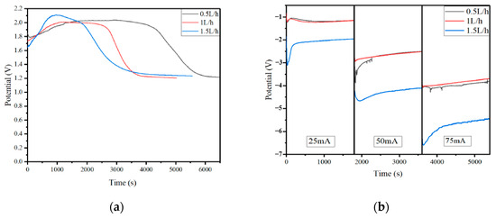 In the process of CO2 battery conversion, the change in CO2 flow had a certain impact on the stability of the battery and the duration of the high-voltage phase. Therefore, a CO2 flow of 0.5 L/h, a CO2 flow of 1.0 L/h, and a CO2 flow of 1.5 L/h were selected to study the impact of flow on battery performance. The battery discharge curve in Figure 4 was thus obtained, calculating the battery’s NaHCO3 generation time, as shown in Table 3.