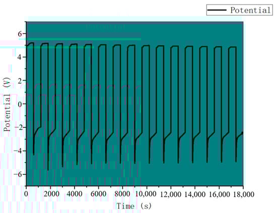 The process parameters of the CO2 battery were determined by the rate of CO2 absorption conversion and battery performance of the catalytic electrode [36], the NaOH concentration, and the CO2 flow of different nanostructures. In order to further determine the stable charging, discharging, and CO2 storage capacity of the CO2 battery, the CO2 long charging and discharging cycle test was carried out. As shown in Figure 5, the battery circulated for 600 min (20 charge and discharging cycles) at an 8 mA·cm−2 current density, showing excellent cycle performance, with an almost constant charge and discharge voltage clearance.