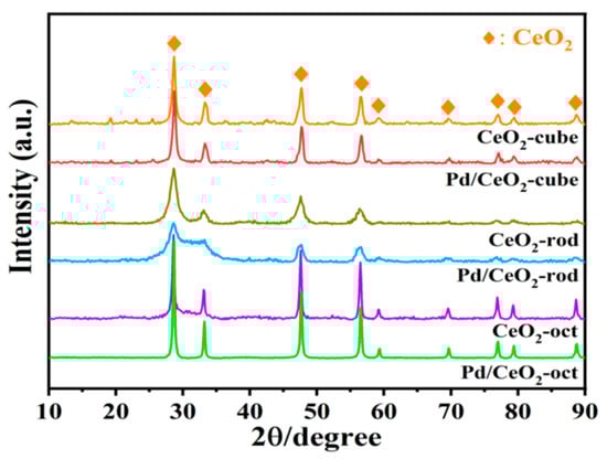 The XRD spectra of the CeO2 carriers and the Pd/CeO2 catalysts with different morphologies are shown in Figure 7. It can be seen that the various catalysts show the same characteristic peaks of CeO2, and there is no relevant peak of the Pd species, which indicates that Pd is highly dispersed on the surface of the CeO2 carrier and that there is no noticeable agglomeration. According to Xiele’s formula [41], after calculating the grain size based on the diffracted peak with the largest intensity, it was found that the grain sizes of Pd/CeO2 became smaller, compared to those of its CeO2 carriers. This indicated that the interaction between Pd and CeO2 triggered lattice distortion and that the XRD patterns of the Pd/CeO2 catalyst were smaller than those of the CeO2 carrier. The diffraction half-peak width of Pd/CeO2 was widened, compared to that of the CeO2 carrier in the XRD spectra.