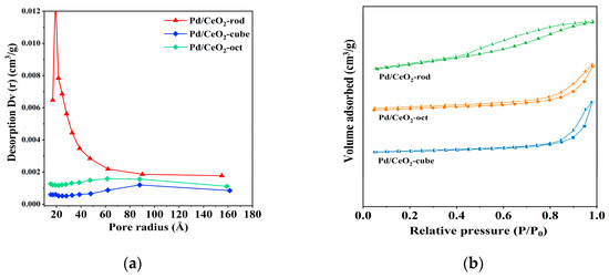The BET analysis results of the Pd/CeO2 catalysts with different morphologies are shown in Figure 8. As can be seen from the left panel in Figure 8, the N2 isothermal adsorption and desorption curves of all three catalysts show H3-type hysteresis loops with IV-type adsorption isotherms, which indicates that the three catalysts have similar pore structures, such as microscopic flat-plate slits, cracks, and wedges [42]. The right panel in Figure 8 shows that the Pd/CeO2-rod catalyst has the smallest pore size and the largest pore volume, which means that d/CeO2-rod can accommodate the largest number of reactive molecules. As such, it might achieve a better catalytic performance. In addition, the Pd/CeO2-rod has the largest specific surface area, followed by Pd/CeO2-oct and Pd/CeO2-cube, which means that the Pd/CeO2-rod can provide the most active sites for the catalytic reaction and the Pd/CeO2-rod has an excellent catalytic performance.
