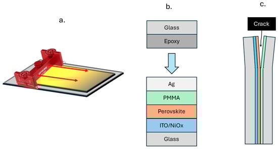Using double cantilever beam testing (DCB), the critical load that is necessary for fracture propagation is found alongside the Gc value. The sandwiched structure samples are tested by the DCB. A necessary part of this fracture testing is creating a pre-crack in the sample to assist crack formation at the perovskite layer. A pre-crack is made by carefully inserting the tip of a razor in between the sandwiched sample and creating a well-defined crack between the two glass substrates (Figure 1c).