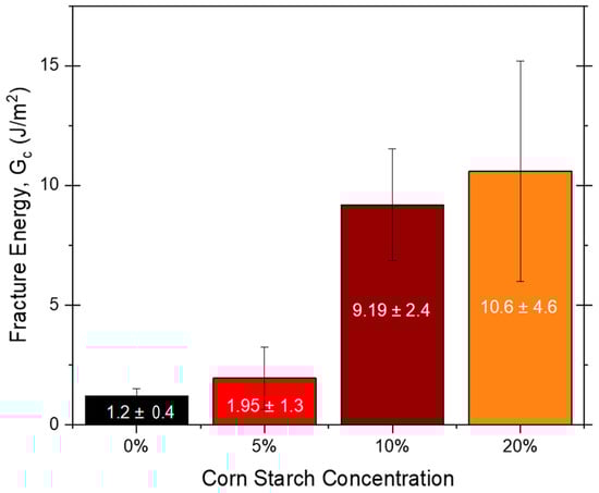 Fracture energy (Gc) of MAPI with 0, 5, 10, and 20 wt% concentrations of starch.