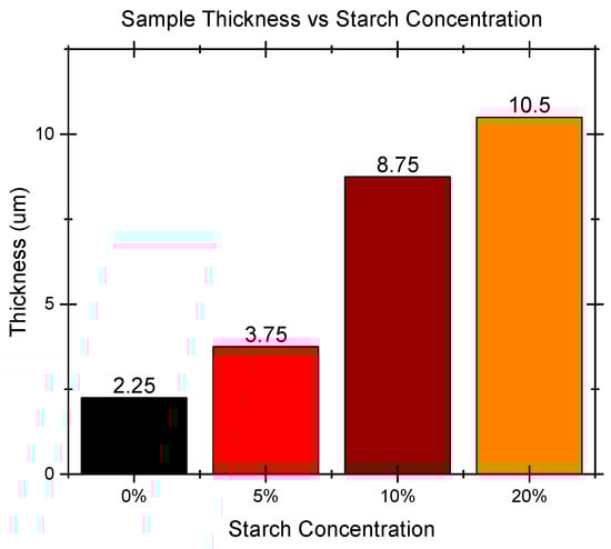 Thickness of MAPI samples with starch additive in 0, 5, 10, and 20 wt% concentrations.