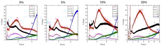 Glow Discharge Optical Electron Spectroscopy (GDOES) depth profiles of ambient blade-coated MAPI samples with 0, 5, 10, and 20 wt% concentrations of starch.