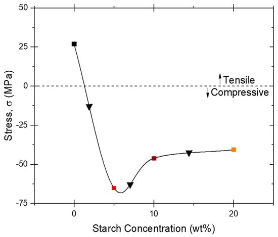 X-ray diffraction was used to study the effect of starch on the residual perovskite film stress after processing using the sin2ψ method (Figure S2a–d). Without any starch, the 0 wt% showed a tensile film stress of 27 MPa. Residual tensile stress is expected and widely reported after processing, as perovskites have a much higher thermal expansion coefficient than glass [37]. Compressive stresses were observed with 5 wt% and higher concentrations of starch additive (Figure 5). The 5 wt% starch resulted in the largest compressive stress at −65 MPa. Additionally, this behavior agrees with previous work that found that the addition of gellan gum and starch polymers induced compressive stresses and translated to blade-coated perovskites [7]. Interestingly, the compressive stress induced by the additive was found to be lower in magnitude with higher starch additive concentration. The 10 wt% and 20 wt% starch additions exhibited slightly less compressive stresses at −46 and −41 MPa, respectively. This effect could be due to the substantial increase in film thickness, which generates internal stress that can offset some of the compressive stress from processing. Compressive stresses within the perovskite are beneficial to the film due to the increased stability and potential healing properties they impart on structural defects [51].