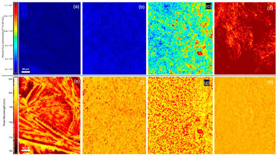 Optoelectronic properties were studied using hyperspectral photoluminescence to map the effect of starch on the emission of MAPI films. From Figure 6, the photoluminescence intensity of the samples at 760 nm increased with starch concentration from ~1013 photons/(cm2·s·eV·sr) without starch (Figure 6a) to ~1014 photons/(cm2·s·eV·sr) with 5 wt% (Figure 6b) to ~1015 photons/(cm2·s·eV·sr) with 10 wt% and ~1016 photons/(cm2·s·eV·sr) with 20 wt% (Figure 6d). From 0 wt% to 20 wt% starch, there was about three orders of magnitude increase in photoluminescence intensity. This observed higher photoluminescence intensity is expected and likely due in part to increased thickness due to the starch. The effect starch has on improving photoluminescence intensity indicates higher built-in voltage, an effect that correlates to the VOC (open circuit voltage) in a device. Photoluminescence intensity offers insight into the photoexcited charge–carrier density, which corresponds to the magnitude of the VOC in a device [52]. Here, the photoluminescence is seen to improve with the addition of starch, suggesting that starch may be able to improve the VOC of a photovoltaic device. This conclusion agrees with previous work that observed a PCE of 18.8% with 10 wt% of starch additive [24].