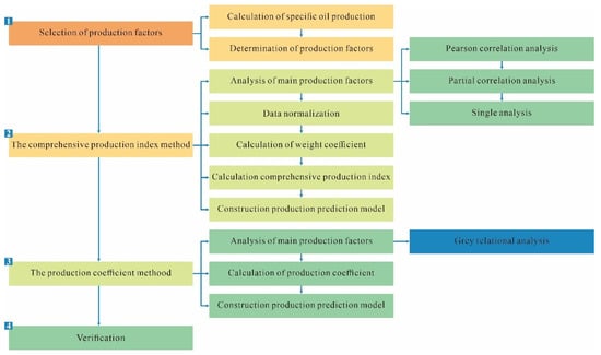 The primary objective of this research is to construct two rapid-production prediction models for test wells in the L Formation of the Beibu Basin. The paper is structured as follows (Figure 1): The comprehensive production index method begins with a Pearson correlation analysis and partial correlation analysis to identify the main production factors: effective permeability, porosity, and oil saturation. Subsequently, a detailed analysis of each individual production factor is performed to determine the correlation coefficient between each factor and the specific oil production index. The corresponding weight coefficients are then calculated based on these correlation coefficients. Using these weight coefficients, a comprehensive production index model is constructed, which is then used to develop a production prediction model. The production coefficient method starts with a grey relational analysis to identify the key production factors: effective permeability, shale content, and porosity. These three factors are then combined to compute the production coefficient. Finally, the production coefficient and the specific oil production index are analyzed and fitted, leading to the development of a production prediction model in the form of a power function. Finally, the effectiveness and feasibility of the two proposed methods are validated using actual oil production data.