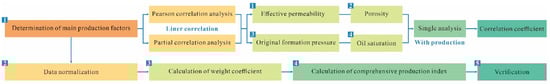 Numerous researchers have employed statistical methodologies, including information theory, univariate analysis, and grey theory, to investigate principal production factors [,,]. The principal production factors within the study area encompass both geological and engineering factors. Researchers such as Hu et al. have concentrated on tight oil reservoirs, developing a numerical model to evaluate production factors [,,,]. The findings suggest that the initial pressure gradient, permeability, reservoir pressure, and stress sensitivity are the primary geological factors impacting production. Furthermore, the length of the horizontal well section emerges as a pivotal engineering factor affecting production. The principal production factors in tight oil reservoirs can be classified as follows: geological factors, comprising porosity, permeability, reservoir thickness, the initial pressure gradient, and natural fractures [,,,,,,,]. The fluid properties include the viscosity and relative density of the crude oil [,,,]. Additionally, engineering factors such as the oil well radius [,,] are considered.