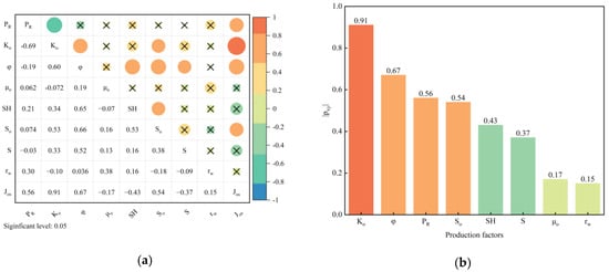 The Pearson correlation analysis of the production factors in the L Formation of the Beibu Basin. (a) Heat map of Pearson correlations among production factors; (b) The ranking of the production factors based on the Pearson correlation analysis.