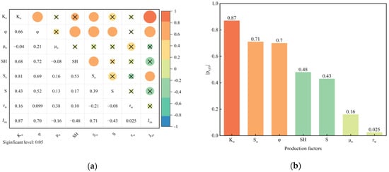 The partial correlation analysis of the production factors in the L Formation of the Beibu Basin. (a) Heat map of partial correlation coefficient among production factors; (b) The ranking of the production factors based on the partial correlation analysis.